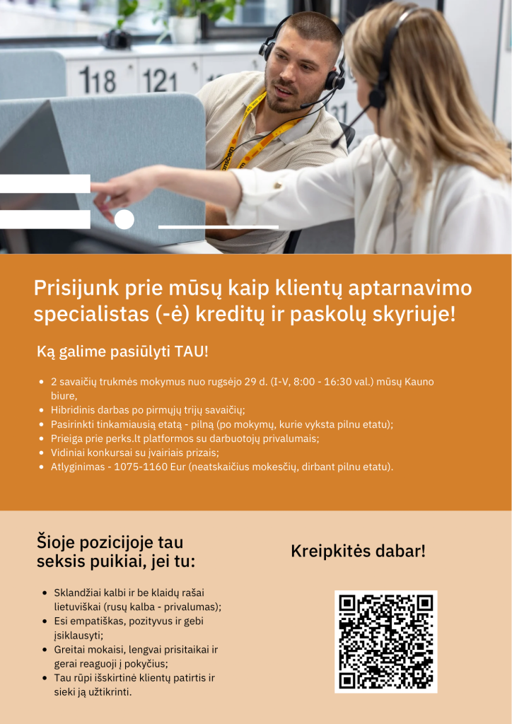Klientų aptarnavimo specialistas (-ė) kreditų ir paskolų skyriuje