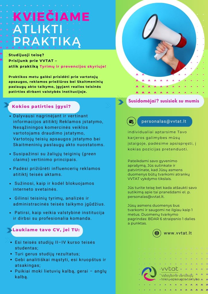 Valstybinė vartotojų teisių apsaugos tarnyba kviečia studentus atlikti praktiką mūsų įstaigoje.