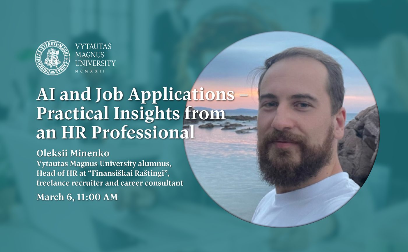 The seminar will be led by Oleksii Minenko, a Vytautas Magnus University alumnus who graduated in 2019 with a Master’s degree in Diplomacy and International Relations. He currently serves as Head of HR at “Finansiškai Raštingi” and works as a freelance recruiter and career consultant.